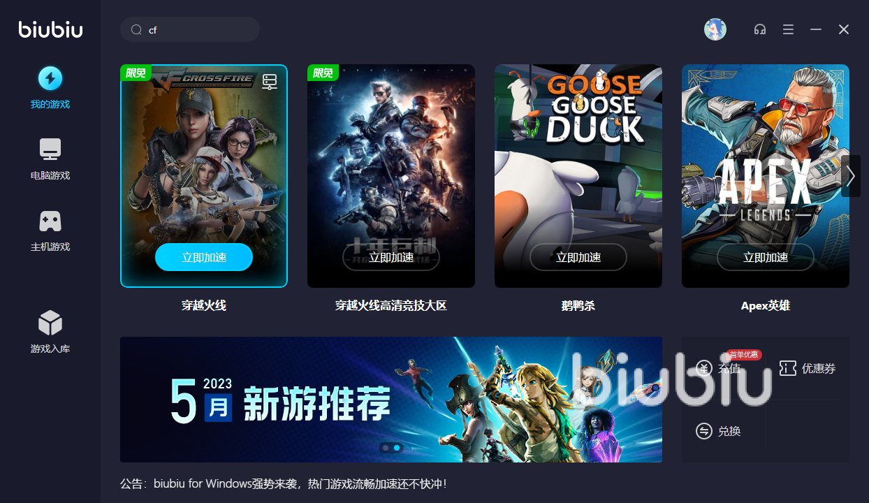 Cf的小伙伴們?cè)赽iubiu平臺(tái)上去使用biubiu給cf游戲進(jìn)行加速的過程也是很簡(jiǎn)單的,流程過一遍就可以學(xué)會(huì)。在cf的玩家們下載好biubiu之后,只需在biubiu平臺(tái)內(nèi)搜索cf游戲,然后點(diǎn)擊選項(xiàng)添加到自己的游戲主頁(yè)中就可以了,之后只要想要玩cf游戲,就可以直接在biubiu游戲中啟動(dòng)。