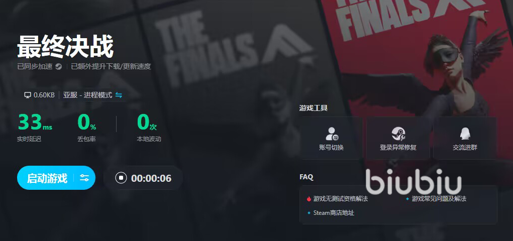 最終決戰(zhàn)這款游戲由瑞典公司Embark Studios開發(fā)并發(fā)行,目前他們還未在國內(nèi)架設游戲服務器。國內(nèi)的玩家在體驗的過程中出現(xiàn)游戲中斷掉線的情況是不可避免的,推薦大家打開biubiu加速器。它擁有業(yè)內(nèi)領先的游戲加速能力,可以直連最終決戰(zhàn)的海外服務器,避免大家游戲中出現(xiàn)中斷。