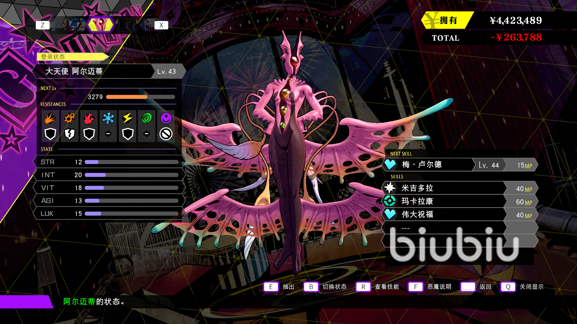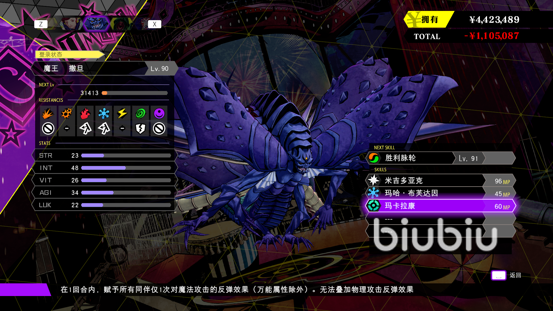 剩余一個(gè)輔助惡魔,算是解場類型的惡魔,他的技能可以讓玩家接觸所有異常狀態(tài),讓玩家在面對高概率debuff惡魔時(shí)候也有一戰(zhàn)之力,中期那個(gè)睡魔,瘋狂睡眠玩家的時(shí)候,玩家就可以通過這個(gè)技能快速解場,值得一提的是,這個(gè)惡魔也附帶了與撒旦一樣的輔助技能,魔法反彈,雖然這個(gè)惡魔戰(zhàn)斗力不強(qiáng),屬性加的也并不多,但是這個(gè)輔助角色確實(shí)可以很好的度過前期沒有消耗品的窘境。