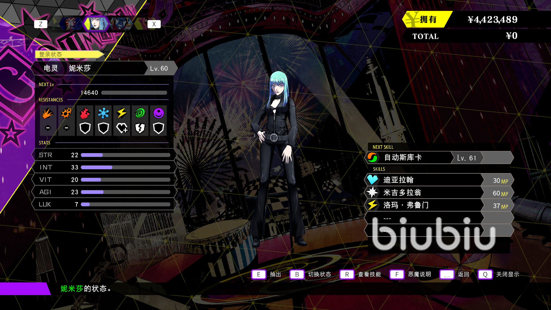 電靈妮米莎,原型來自拳皇的電女,他有一個(gè)恢復(fù)全體所有生命值的輔助技能,一個(gè)全體大量電擊屬性的aoe技能(血量越低,傷害越高),以及一個(gè)對敵人造成大量萬能傷害的技能,這個(gè)角色比較適合那種狂戰(zhàn)士打法的玩家,值得一提的是,在前期沒有拿到電擊免疫的怪之前,這個(gè)怪自帶一個(gè)電擊反彈,可以很好的過度,因?yàn)榇蟛糠止侄紩в须姄艏寄?,尤其是幾個(gè)boss,算是一個(gè)比較好用的輔助角色。