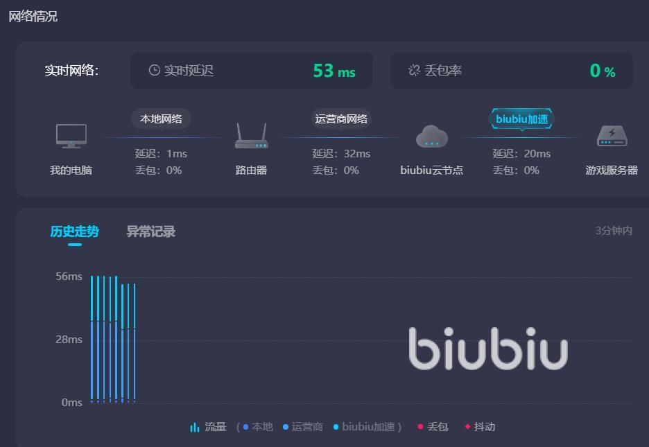 加速功能開啟之后,系統(tǒng)就會實時進行監(jiān)控網(wǎng)絡(luò)的變化,期間的實時延遲、丟包率等信息都會以折線圖的形式展現(xiàn)出來,直觀地展示給用戶加速的效果,網(wǎng)絡(luò)只要出現(xiàn)了異常,都會被如實地記錄下來。
