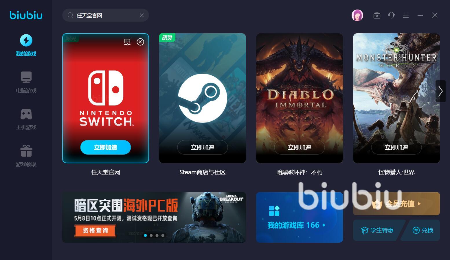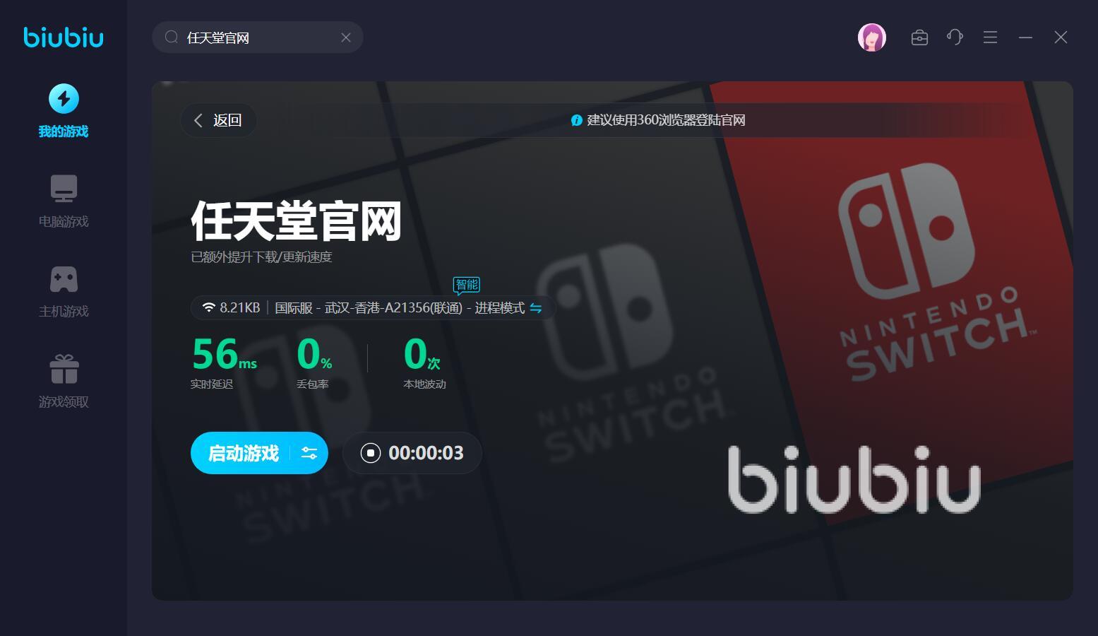 在他們的官方網(wǎng)站里面,還會推送一些實時的資訊,讓你了解到該公司近期的情況和未來的計劃,其中還會上架許多新鮮有趣的游戲和外設(shè),大家可以直接在網(wǎng)站里面進行購入,去改善自己的游戲體驗,探索更多不一樣的游戲內(nèi)容,期間,你可以用biubiu加速器改善一下網(wǎng)絡(luò),這個應用的界面設(shè)計十分簡潔,并且經(jīng)過多次更新之后,當前版本的操作也很簡單,無論你此前用沒用過類似的軟件,都可以快速地上手,就以任天堂官網(wǎng)為例,想要給其加速只需找到對應的加速入口,并點擊立即加速即可。