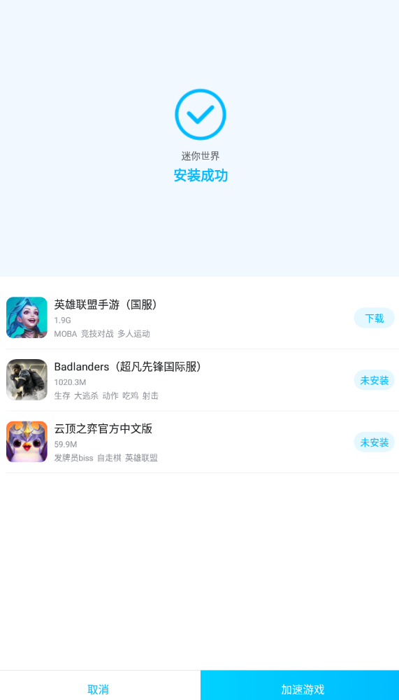 完成了游戲的下載之后,玩家可以直接安裝這款游戲了,安裝好游戲之后,玩家可以在安裝成功界面下方,找到加速游戲選項,點擊這個選項,就可以開始這款游戲的加速了。