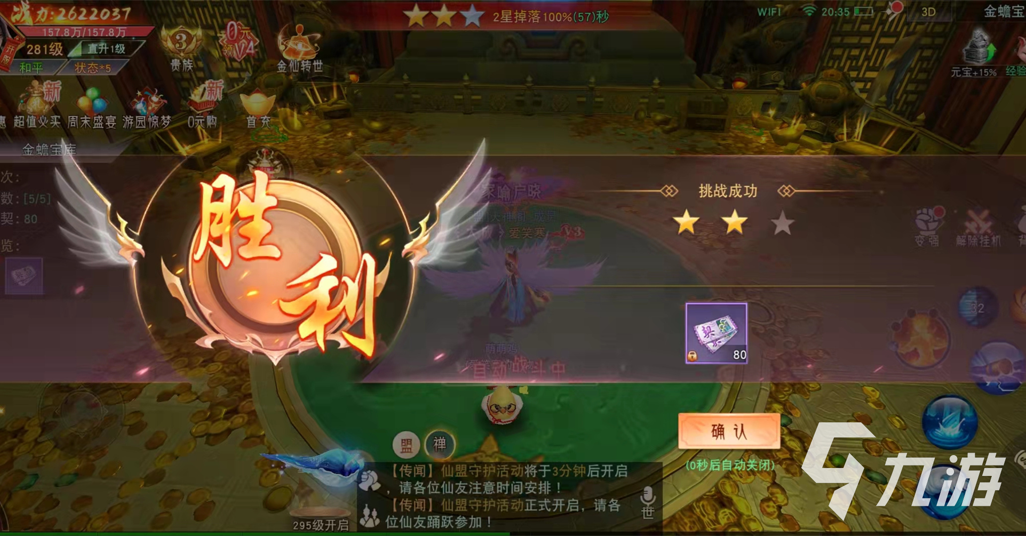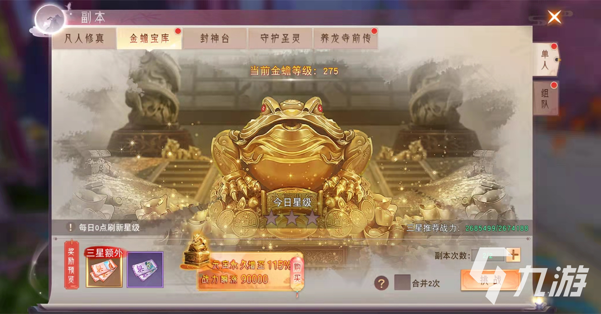 正常情況下是三星滿級,在小編金蟬等級是275的時候,玩家獲勝并且達(dá)到三星,系統(tǒng)會為玩家推薦玩家的戰(zhàn)力值,是2674188,小編的戰(zhàn)力值是2685499,在闖本關(guān)卡的時候得到三星的概率還是有希望的,每一天玩家會有兩次免費的金蟬寶庫挑戰(zhàn)次數(shù),玩家先進(jìn)行游戲就可以點擊挑戰(zhàn)了。