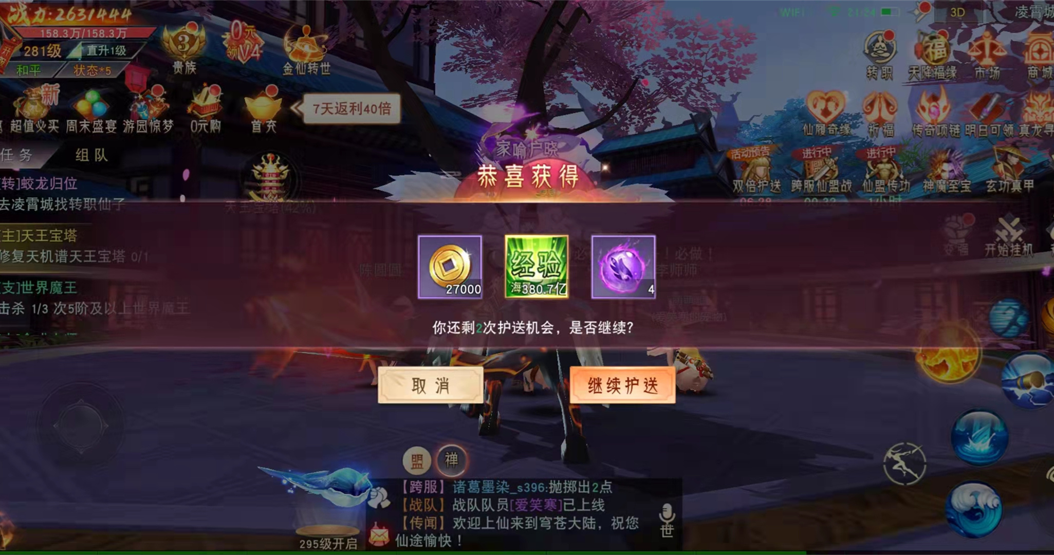 任務(wù)完成時,系統(tǒng)會讓,莫風(fēng)情提示玩家,玩家是不是累了,請玩家坐下來歇歇腳,玩家觸碰屏幕就會提示玩家護送成功,玩家可以獲得的獎勵獎品,玩家一天一共三次機會,如果玩家想一次都做完任務(wù)就可以點擊繼續(xù)護送,如果玩家想等到雙倍經(jīng)驗的時候就可以點擊取消了。