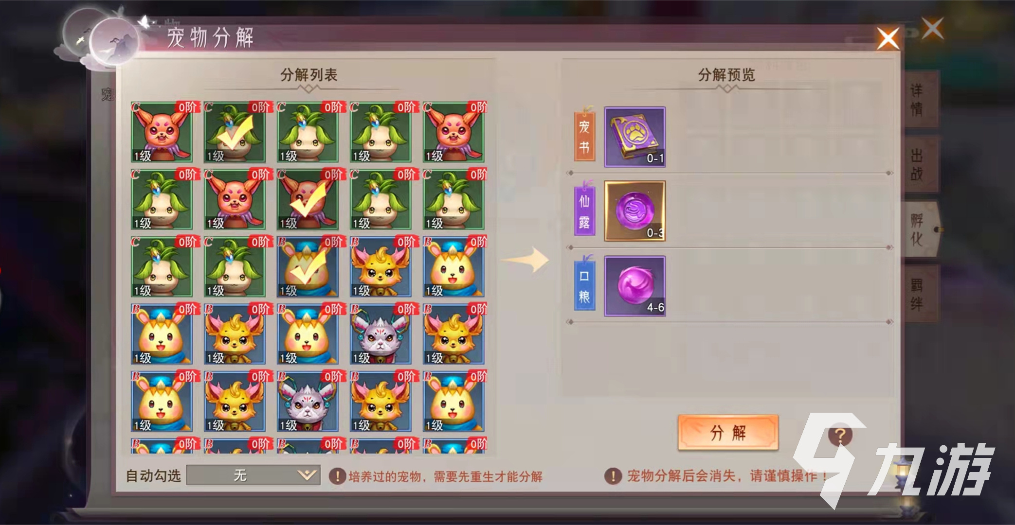 第二種方法是在寵物分解中獲得寵物技能書,玩家在最右下角找到寵物選項,點擊進入寵物界面,玩家首先看到的是孵化界面,右面還有詳情,出戰(zhàn),和羈絆,新手玩家都說沒有看見分解啊,怎么分解啊,跟著小編一起看寵物界面的最左上角,有很小的四個字寵物分解,玩家點擊進入就可以看見可以分解的寵物列表,但是不是每一個寵物可以分解之后獲得寵物技能書的,C級一級的寵物分解之后是不能獲得寵物技能書的,B級一級以上的寵物分解之后可以獲得寵物技能書哦。