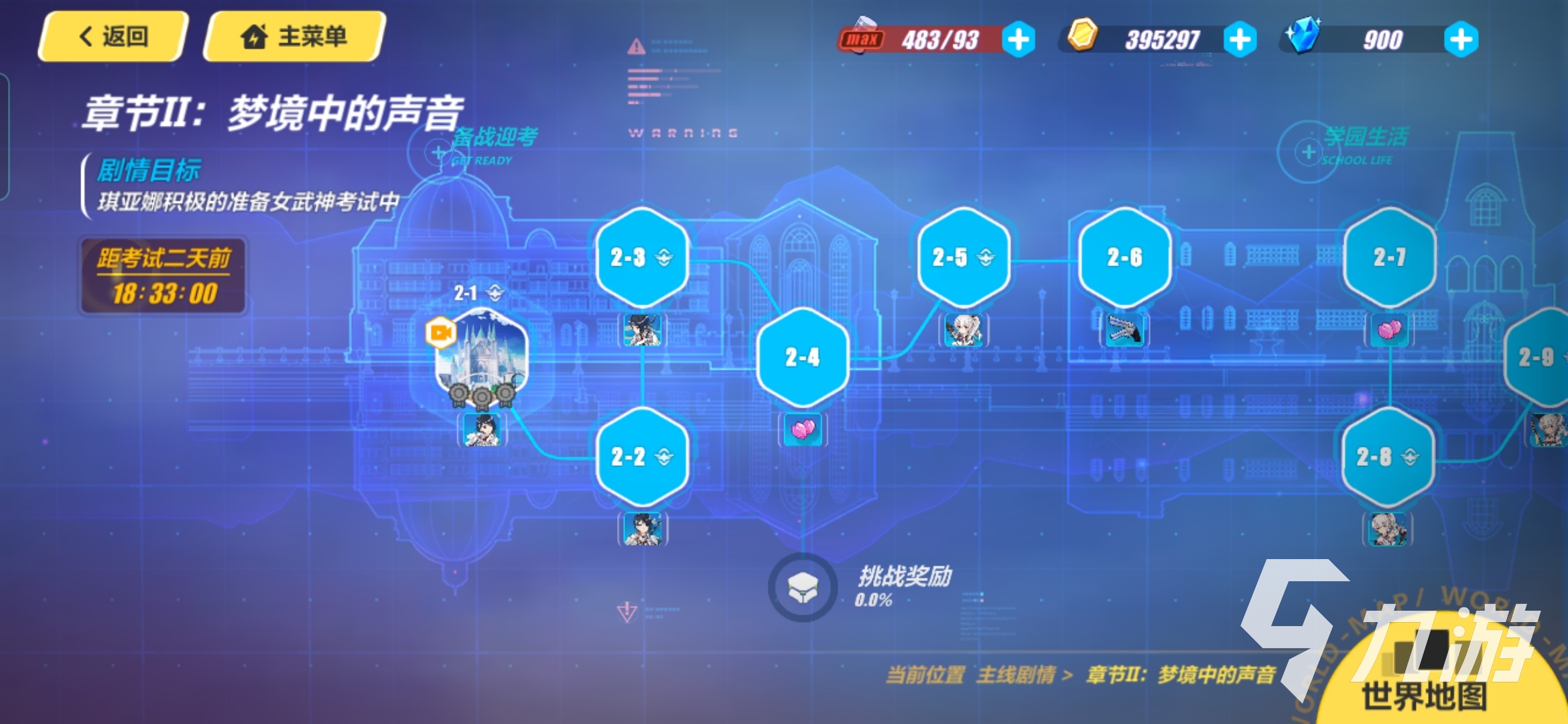 玩家在主界面點擊出擊按鈕就可以來到玩家的闖關(guān)進度了,其中第二章的第一關(guān)就是重返校園,這一關(guān)相比于第一章的關(guān)卡來說,難度大了很多,所以需要玩家開始考慮女武神的搭配問題了,不能再隨意上陣角色了!