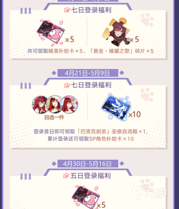 此次游戲的登錄獎勵非常豐厚,總計可以拿到10個精準(zhǔn)補(bǔ)給卡,同時包含新sp角色的碎片,與專屬圣痕自選一個,并可以拿到10張的sp角色補(bǔ)給卡,這個登錄獎勵可以說是非常豐厚的,大家如果抽圣痕的話,獎勵先不要去領(lǐng)取,等自己差最后一個圣痕的時候,然后再去領(lǐng)取,這樣就可以拿到三件套了。
