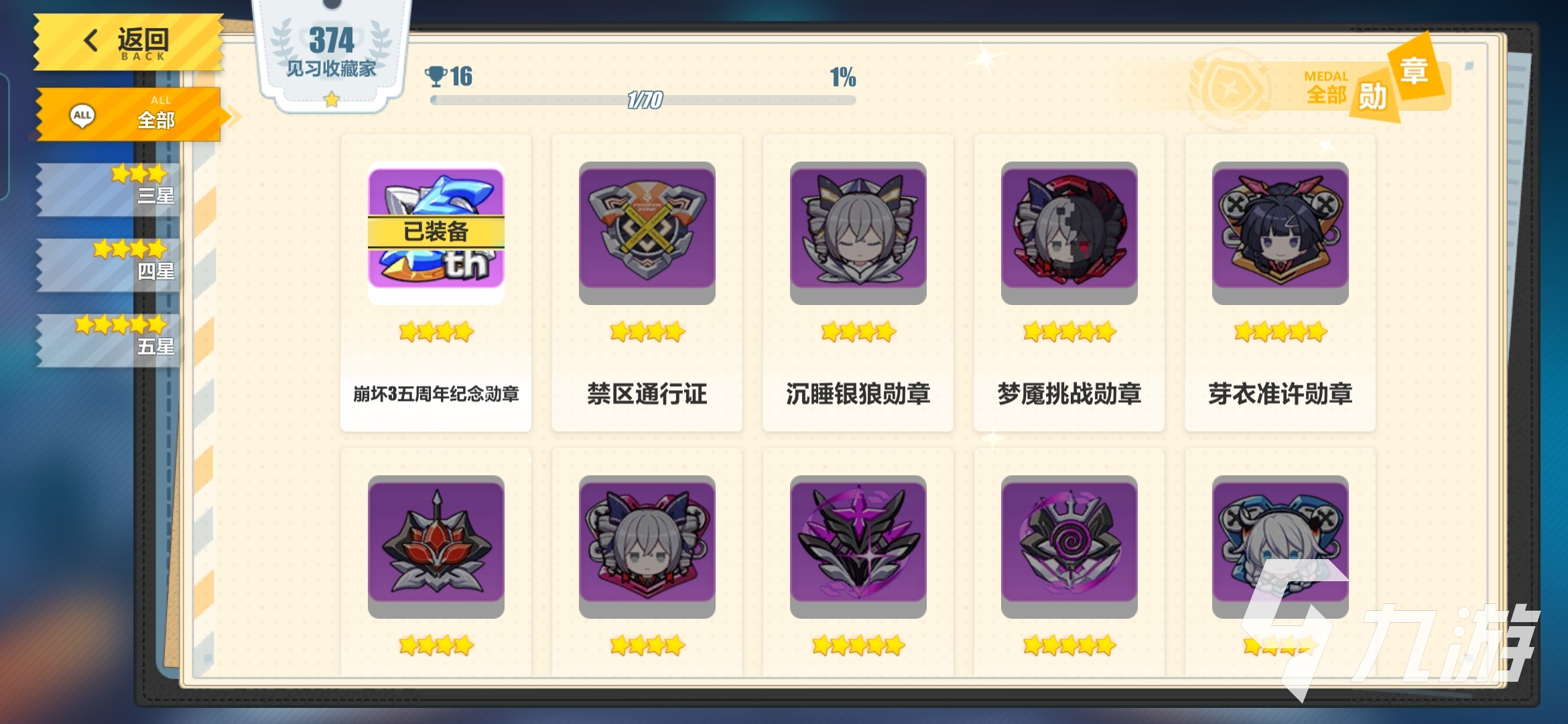 游戲中的勛章也是分等級的,總共有三星到五星的勛章供玩家選擇,還有一種比較特殊的就是周年紀(jì)念勛章了,這個不需要玩家做什么任務(wù)就可以獲得,比如五周年紀(jì)念勛章就可以免費獲得,雖然是免費獲得的勛章,但是它依然會有加成給到玩家的!