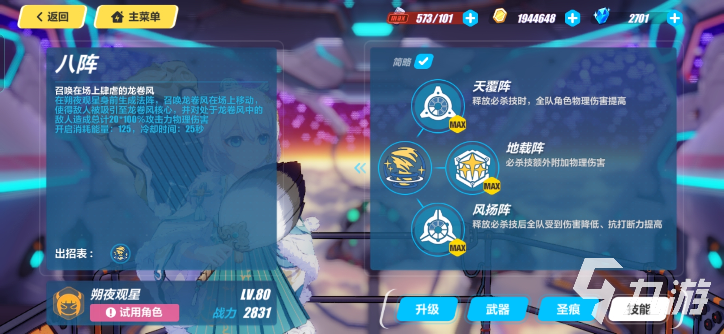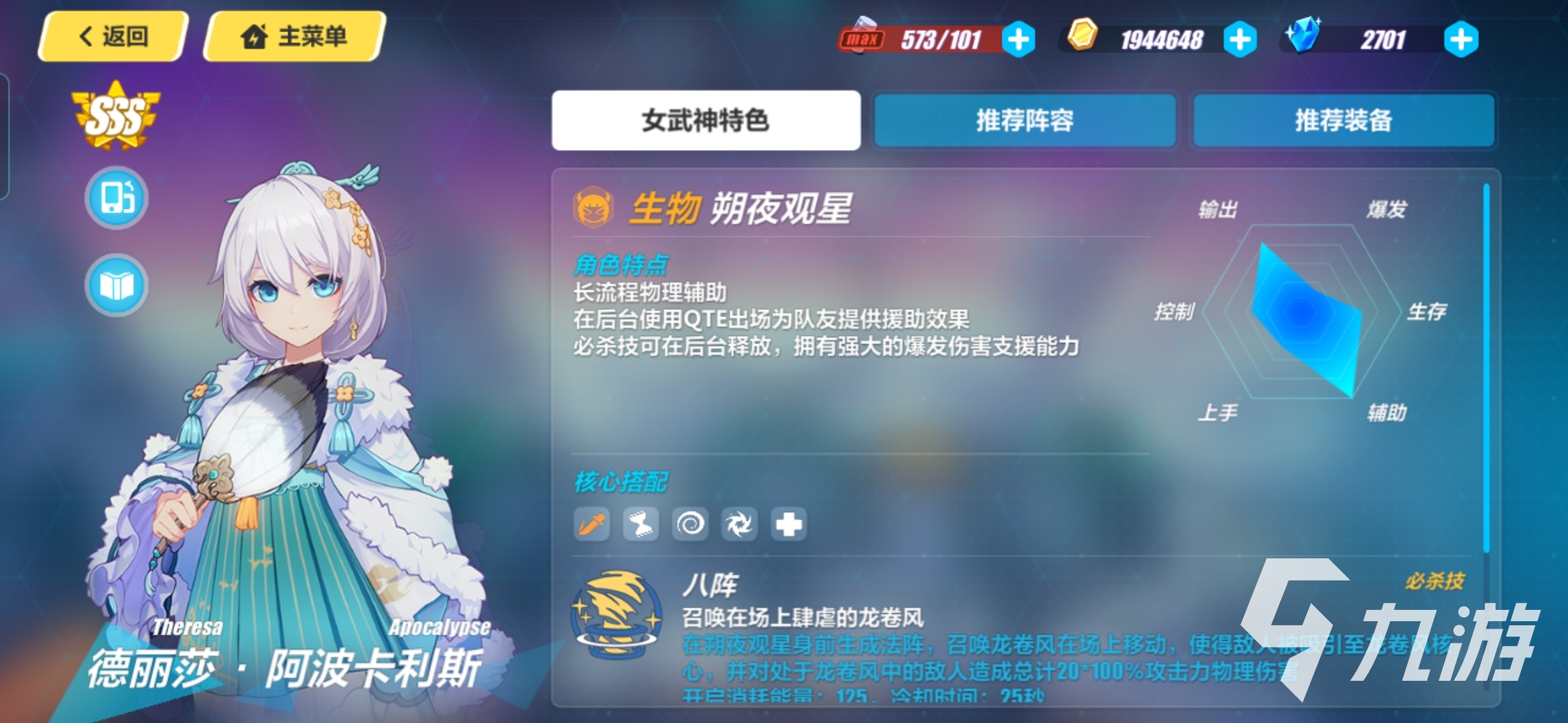 技能方面,德麗莎阿波卡利斯的必殺技是八陣,可以召喚龍卷風并可以自由的控制龍卷風的移動,將敵人吸引到龍卷風中心,造成二十倍的物理傷害!