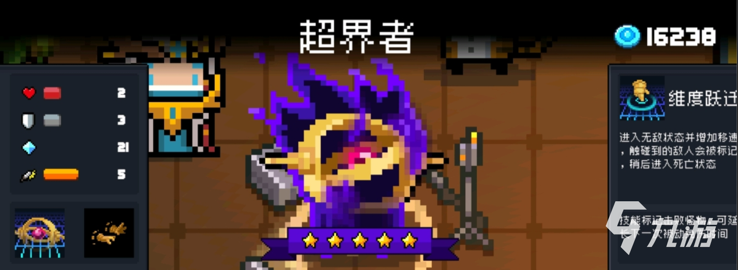 在拿到了這兩本書之后,我們在大廳向右走,這里有一個鍛造臺,我們將書在這里合并,就能夠解鎖超界者了。接下來介紹一下這個角色的技能,技能觸發(fā)后,隱身并且變得無敵,觸碰到的敵人在一段時間后會直接死亡,BOSS除外,還是非常強力的,畢竟獲得十分困難。