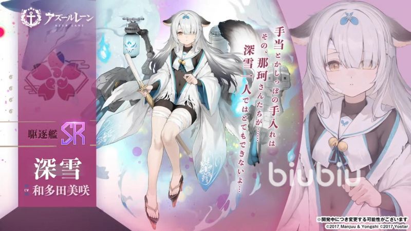 本次碧藍(lán)航線日服生放送的新sr驅(qū)逐艦深雪有著白灰色的長發(fā),左邊長發(fā)遮單眼。造型上是重櫻一貫的動物園風(fēng)格,后面有一條長長的尾巴。從立繪上來看,背景是一只灰白色的狐貍。在背景的分布中有幾朵淡藍(lán)色的狐火作為點(diǎn)綴,煞是可愛。