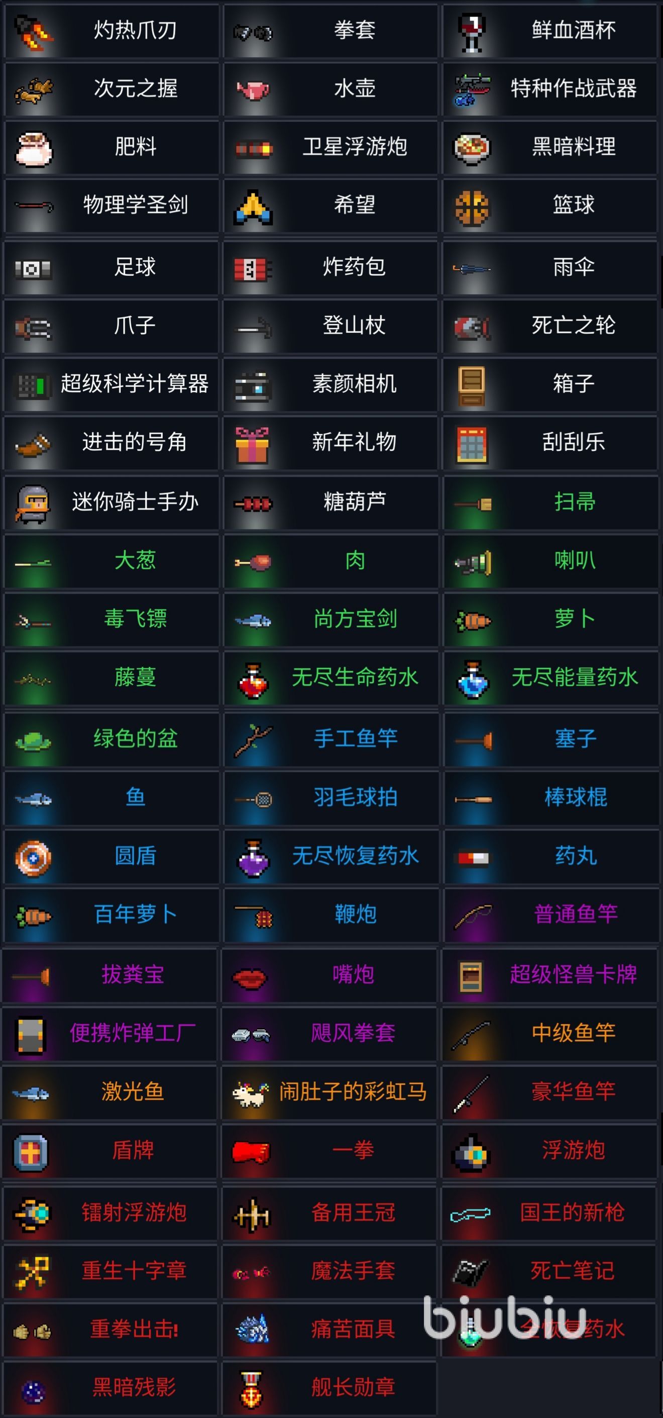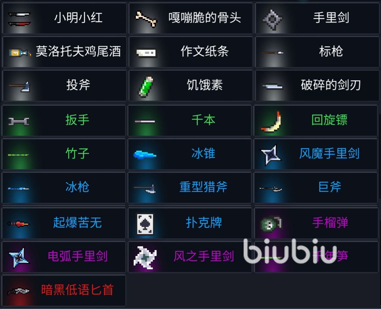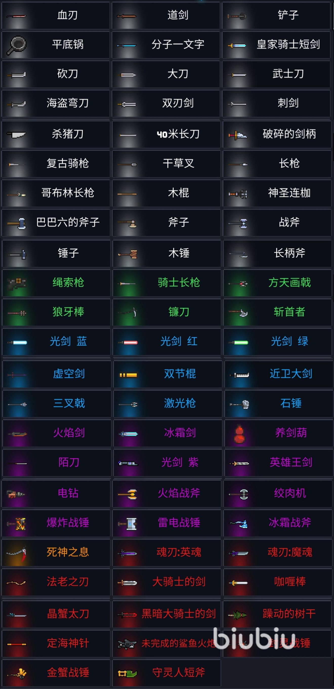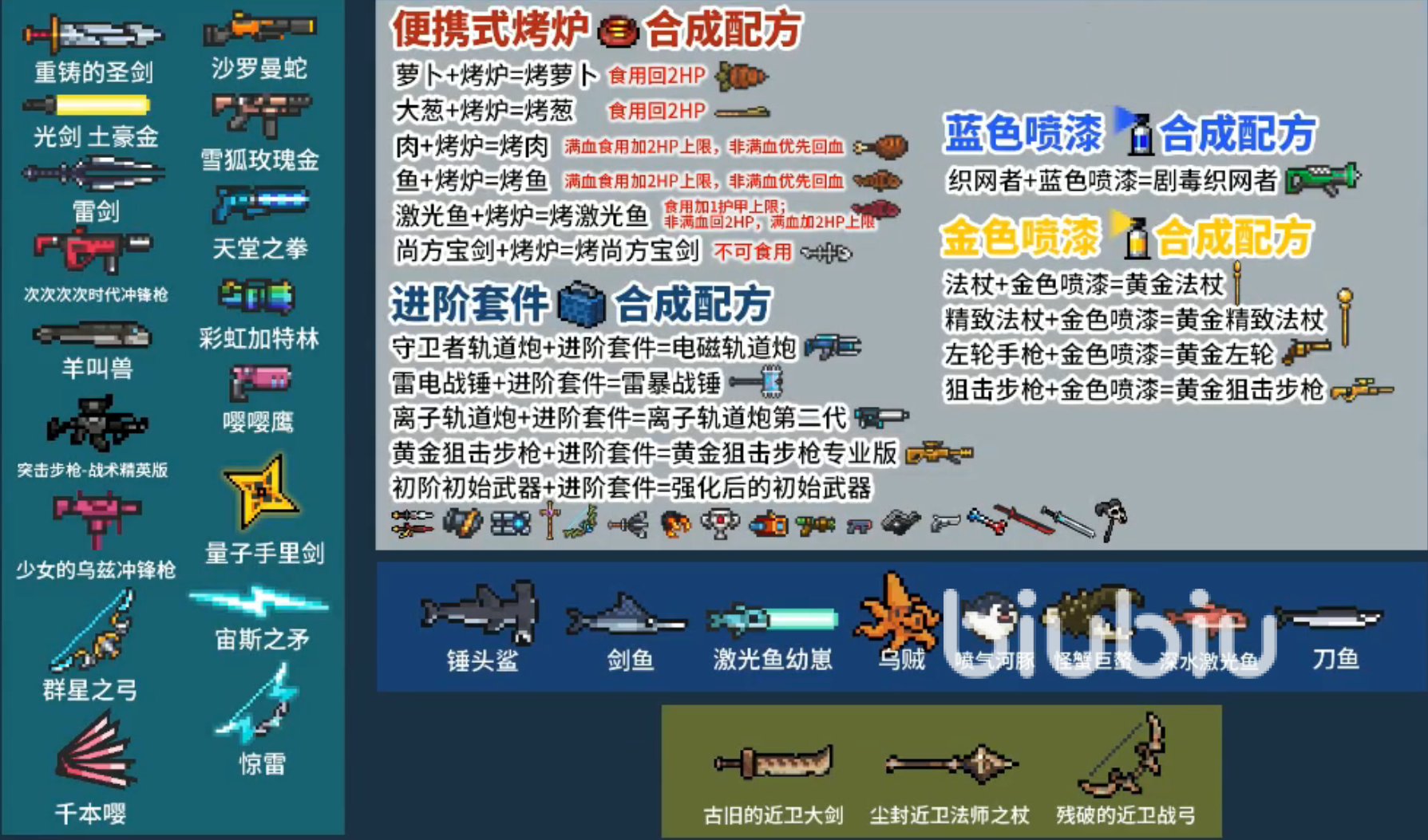 除此之外,像【空手】和【聯(lián)攜指環(huán)】這種默認(rèn)擁有的之外,無法直接鍛造的主要是一些強(qiáng)力的合成武器、進(jìn)階類武器(包括初武)以及釣魚獲得的武器和3把殘破的古代武器。如果我們不算初武的話,那就是43種武器。