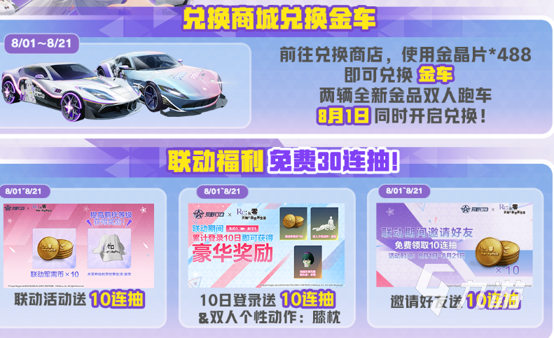 在活動期間,游戲將會開啟兌換商店。玩家們只需要準備488的金晶片便可以兌換金車了。這次的兌換商店里面有著兩輛全新的金品雙人跑車,在8月1日的時候將會同時開啟兌換。玩家們如果對新車感興趣的話可以前去進行兌換。