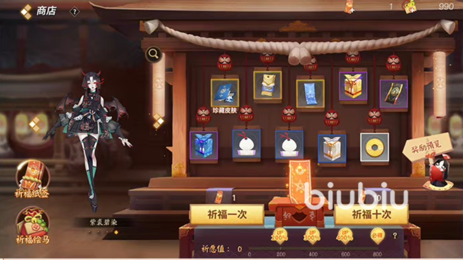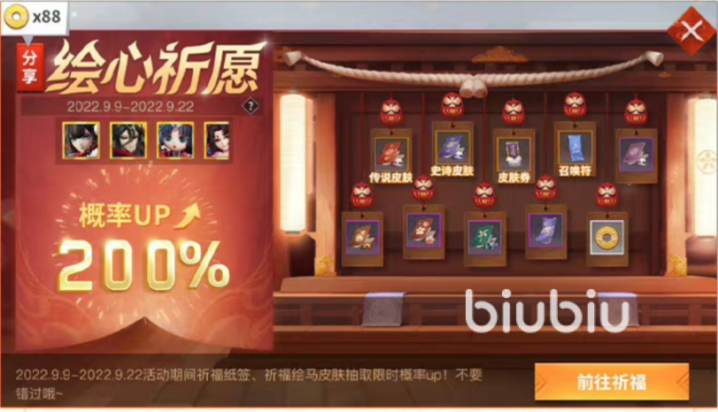 9月9日維護(hù)后到9月22日期間祈福繪馬和祈福紙簽在祈福神龕中抽取活得傳說(shuō)和史詩(shī)級(jí)皮膚的概率會(huì)大大提升,在目前祈福神龕之中一共有雪女,鬼使黑,山兔三個(gè)式神的傳說(shuō)級(jí)皮膚和史詩(shī)級(jí)皮膚各兩個(gè),妖刀姬和姑獲鳥(niǎo)的史詩(shī)皮膚各一個(gè)。