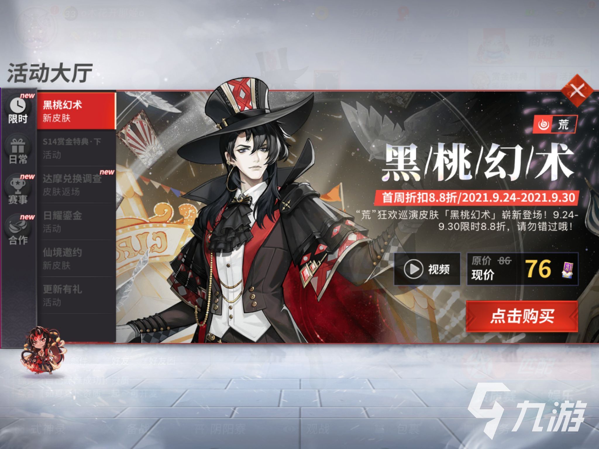 來源: 極光 作者: 檸檬 2021年09月30日 14:54決戰(zhàn)平安京手游擁有多種式神,包括巫、射、守、忍、祝等。這些式神具有多種屬性與技能,從而發(fā)動主動和被動技能,下面小編介紹一下手游決戰(zhàn)平安京黑桃幻術(shù)皮膚如何獲得。