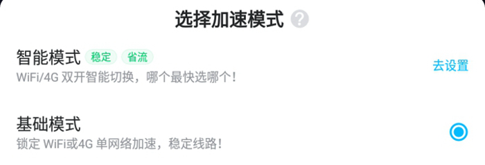 軟件支持基礎(chǔ)模式和智能模式這兩種不同的場景和操作模式,強(qiáng)烈推薦大家選擇智能模式,能夠在移動數(shù)據(jù)或者是WiFi信號有波動的時候為我們進(jìn)行自動的切換和平衡,為我們帶來更加穩(wěn)定的體驗。當(dāng)然了,如果大家習(xí)慣了僅開啟WiFi游玩,那么選擇基礎(chǔ)模式也是沒有問題的,具體要看大家的情況和需求。