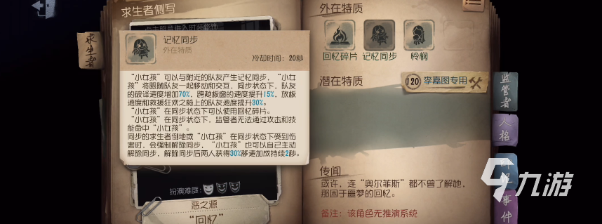 逃生者小女孩的強力之處主要體現(xiàn)在它的技能組合上,想要發(fā)揮出小女孩的長處我們就需要深入了解并掌握這些技能的使用方法和時機。小女孩的技能一共有三個,分別是回憶碎片,記憶同步和傳送?;貞浰槠梢栽谌我獾攸c丟下碎片,形成一個類似跳板的區(qū)域?qū)⑻由邚楅_,記憶同步可以讓小女孩在接近隊友時增加行動速度。而傳送則可以讓小女孩傳送到隊友身邊。
