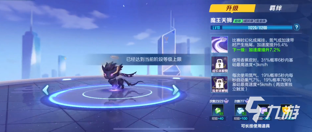 完全體滿級一技能:比賽時幻化成尾掛,氮氣或加速帶時產(chǎn)生拖尾,加速度提升12%。