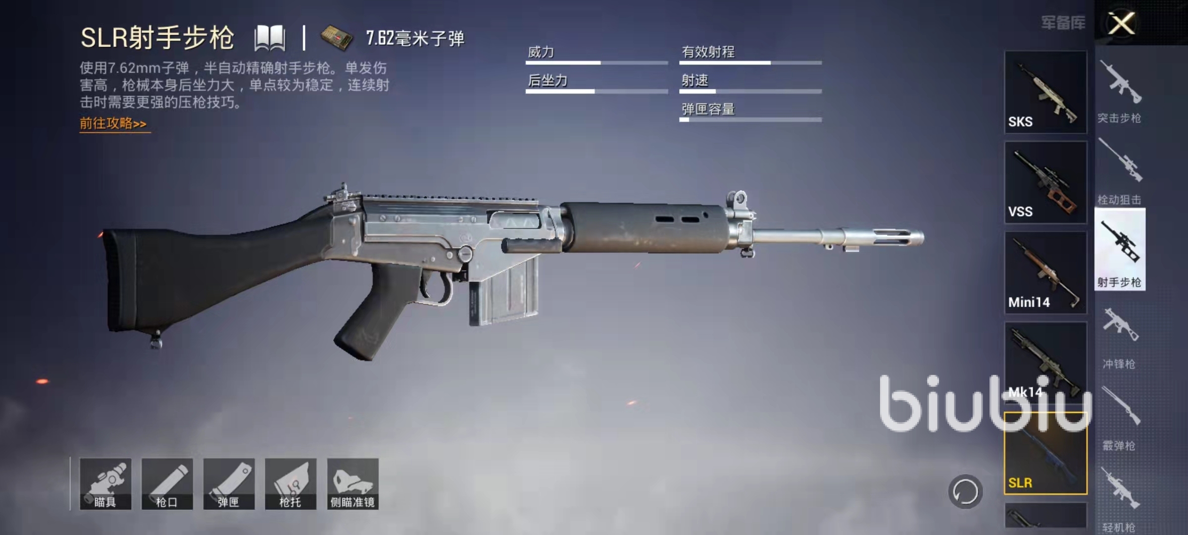 SLR是傷害最高的一把常規(guī)連狙,同時(shí)兼具高射速的優(yōu)點(diǎn),無(wú)論打靶、火力壓制還是對(duì)槍?zhuān)琒LR幾乎不需任何狙擊槍。
