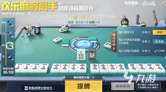 最后就是麻將模式的一些福利活動了。通過歡樂麻將高手活動我們每天上線之后通過完成任務可以獲得摸牌資格,一旦摸到指定的缺牌卡組就可以胡牌。參加歡樂麻將高手活動玩法可以獲取永久動作少女節(jié)拍。