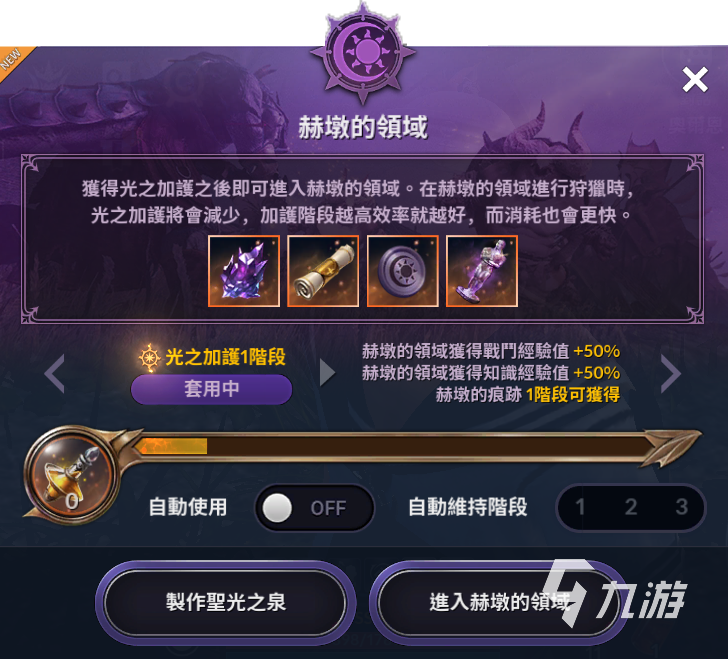 進(jìn)入刷怪領(lǐng)域需要有光屬性的圣光之泉來獲得“光之加護(hù)”,使用光原石便可以制作圣光之泉。光之加護(hù)有3個(gè)階段,最高可以提升500%的經(jīng)驗(yàn)獲取。注意如果和其他經(jīng)驗(yàn)buff一同使用,圣光之泉消耗速度會(huì)受到影響。