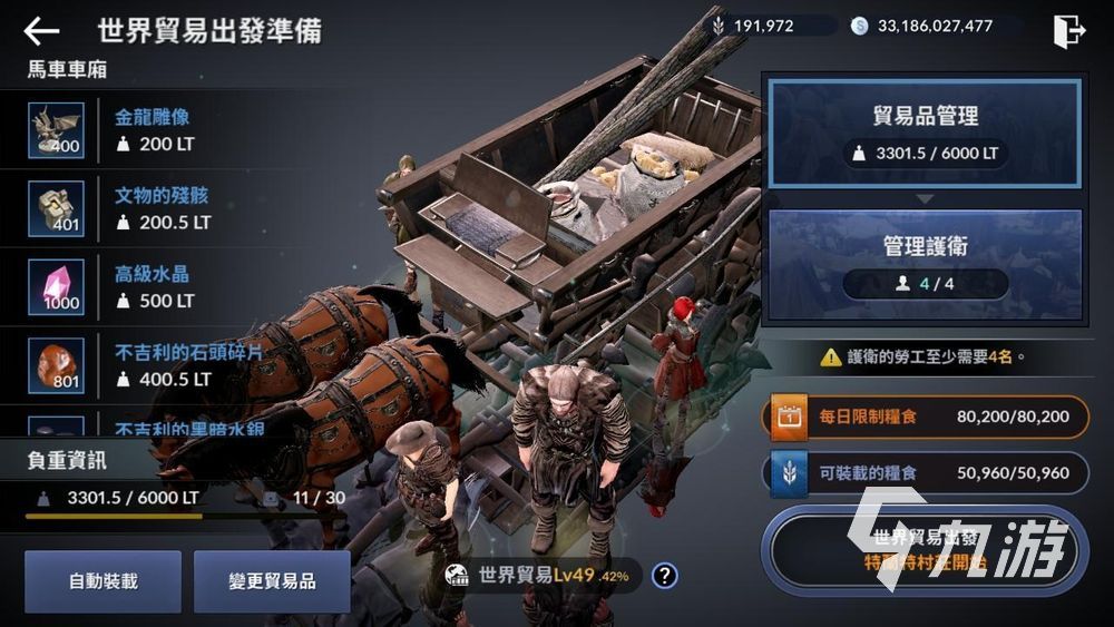 上述工作都準(zhǔn)備妥當(dāng)之后,小伙伴們也需要看一下糧食,畢竟貿(mào)易路上也是需要吃喝的,而糧食帶多少也是有要求的,它需要超過(guò)馬車(chē)負(fù)載的百分之二十,而且之后的貿(mào)易等級(jí)提升上來(lái)了,糧食的可用量也會(huì)隨之提升。