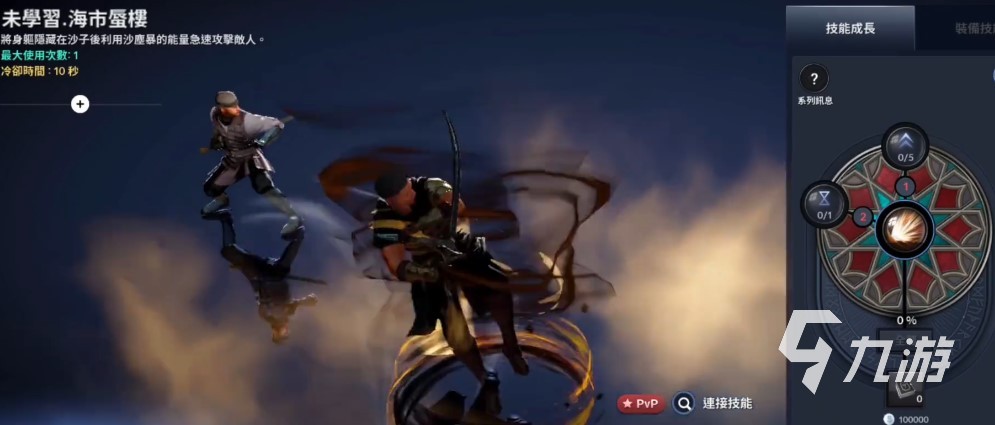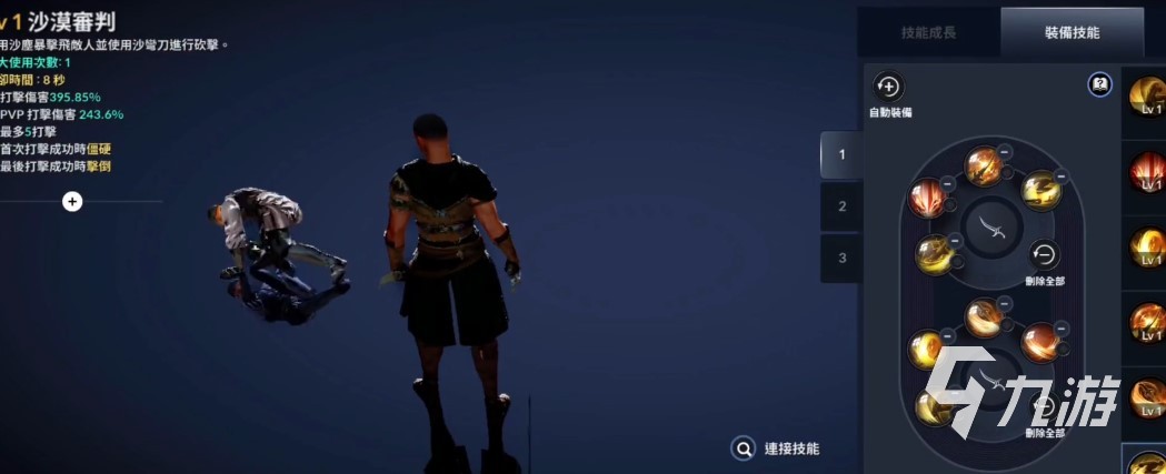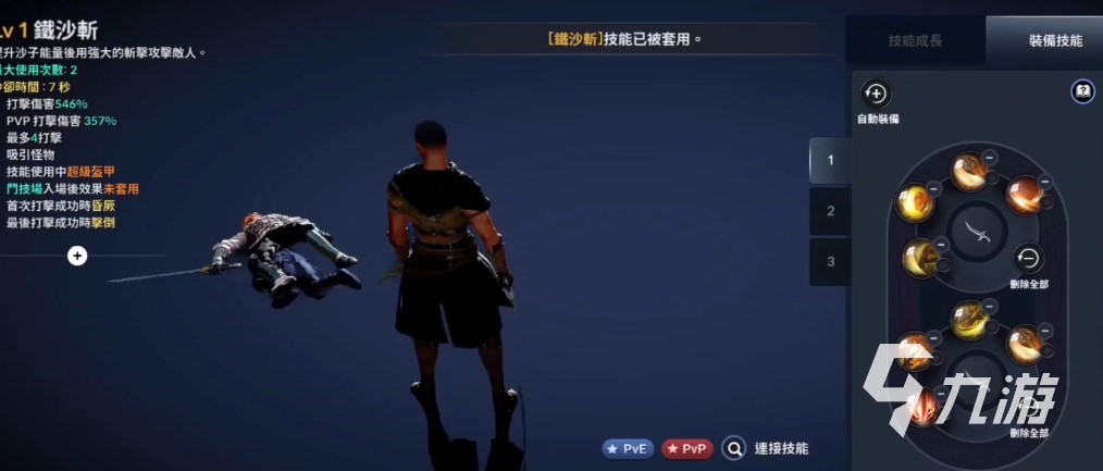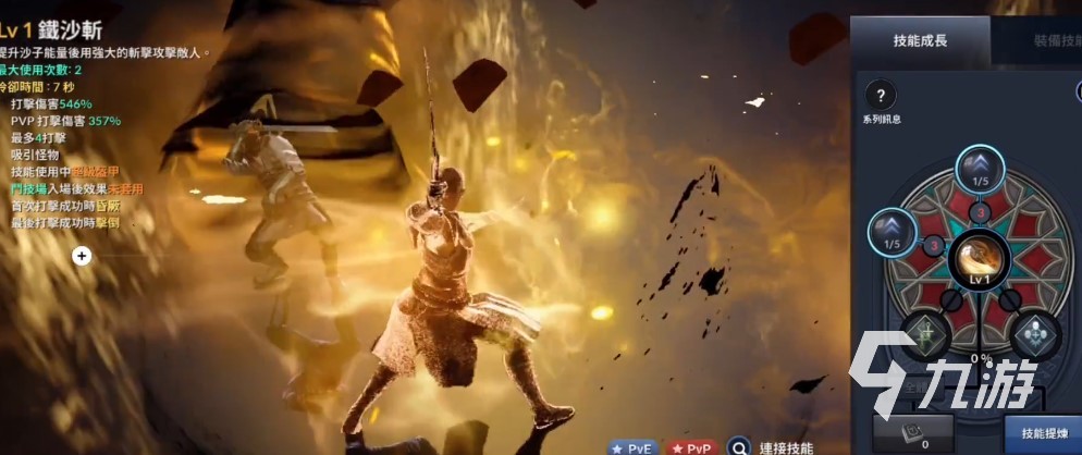 pvp的技能裝備,首先第一個輪盤帶有霸體的,比如說熱沙風暴、干枯暗襲、鐵沙斬。然后再裝一個有防前的技能,比如說沙刑斬。而下方的那個輪盤,則放傷害倍率最高的,比如沙土苦行,授命之刃,沙彎刀、鐵沙這類的。