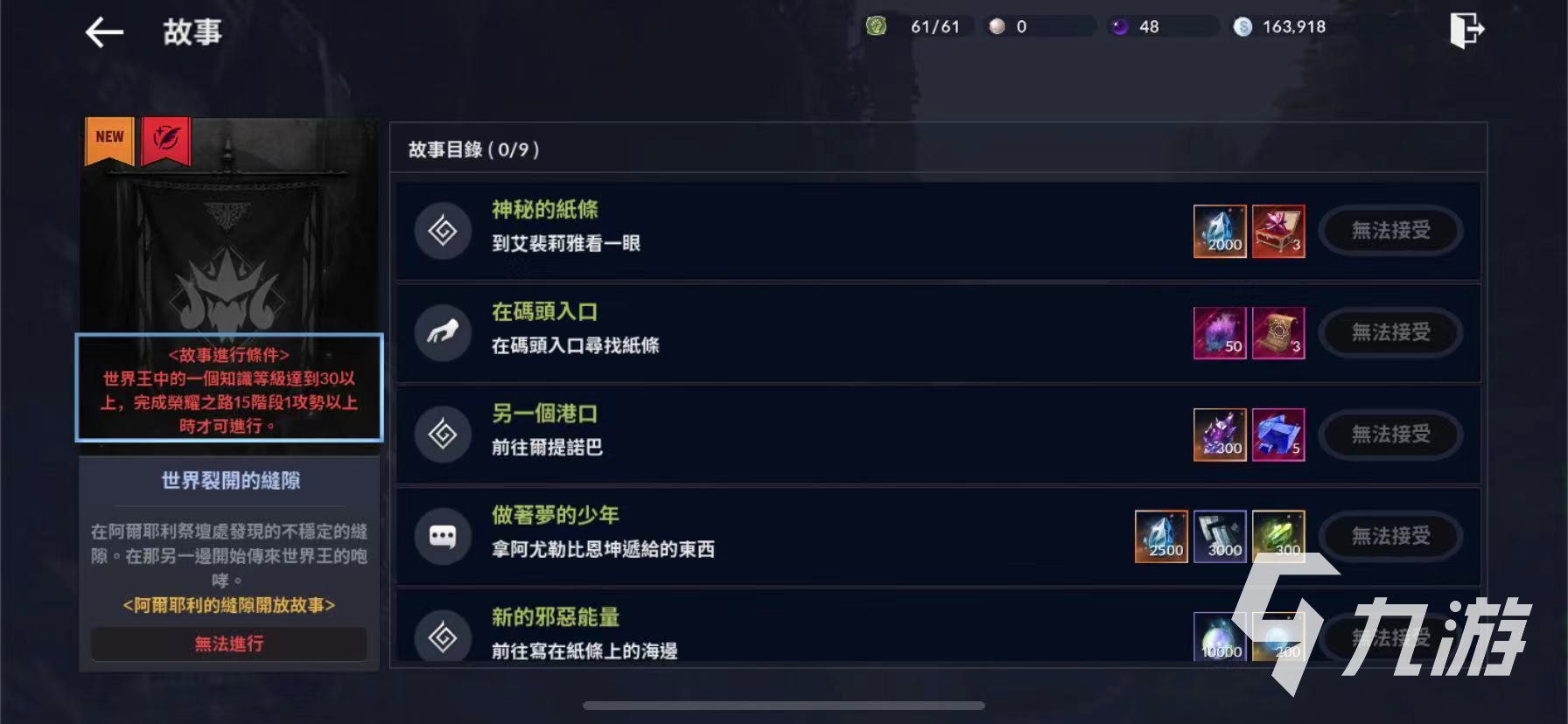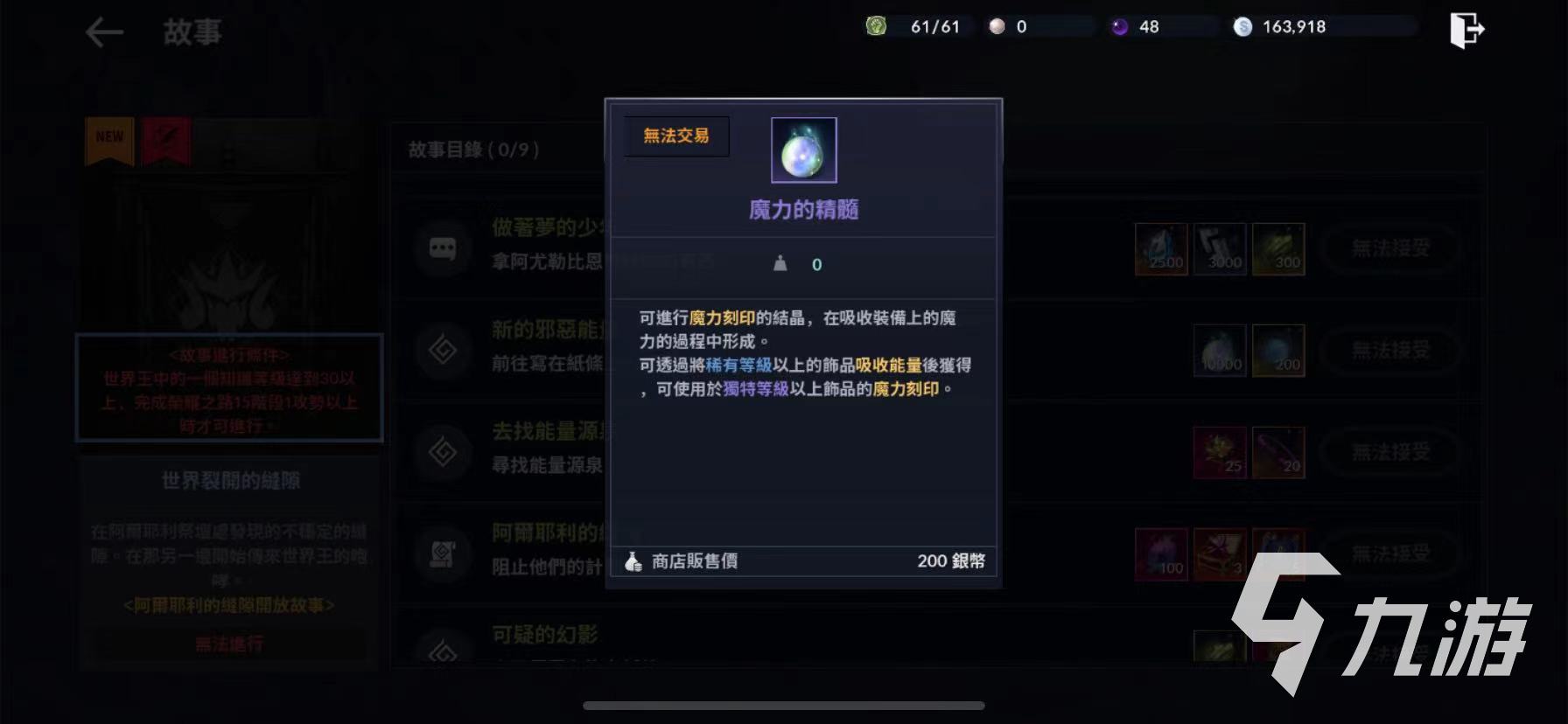 由于魔力的精髓屬于游戲內(nèi)稀有道具,因此獲取方法也是比較復(fù)雜的,首先玩家可以通過完成故事進(jìn)度獲取,在游戲主頁面點(diǎn)擊右上角的三道杠進(jìn)入菜單界面,找到故事板塊,按照要求完成第一個世界王的故事劇情,即可獲取15000個魔力的精髓,不過想要參與該故事是有一定的前置要求,需要玩家等級達(dá)到30以上,并且完成榮耀之路15階段方可解鎖。