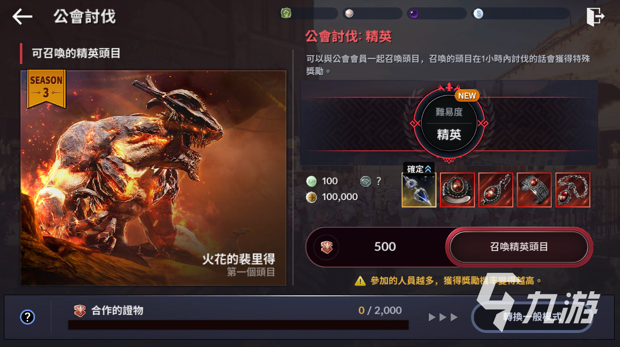通過參加公會的各級別討伐,能夠得到合作的證物,用500個證物就能挑戰(zhàn)更高級的挑戰(zhàn)“公會討伐:精英”。獎勵可就豐厚咯,有金色紅色的飾品。