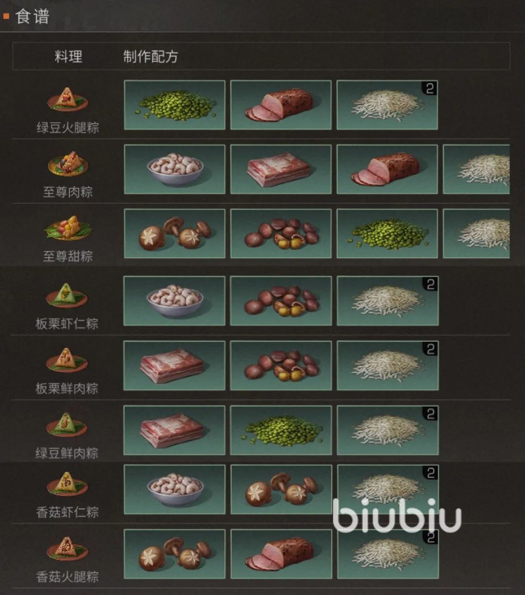 而此次活動可以制作的粽子一共有八種,每一種需要的食材自然是不太一樣的,小伙伴們需要用到相應(yīng)的食材才能做出對應(yīng)的粽子來,這不難理解,就和平時制作其他料理一樣的道理。至于不同粽子的制作配方,小伙伴們可以直接參考下圖: