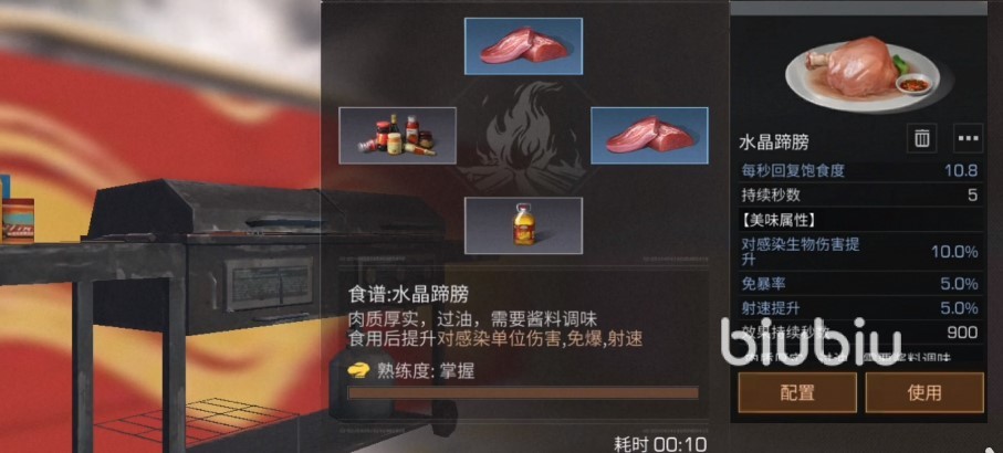 水晶蹄膀:制作所需要的材料有兩塊豬肉、各種調(diào)味料、花生油,效果為射程增加百分之五,免疫對方百分之五的爆傷,對敵人造成傷害增加百分之十,每秒回復(fù)十點(diǎn)八的饑餓值,效果持續(xù)時間為五秒,食物制作時間為十秒,食用后冷卻時間為九百秒。