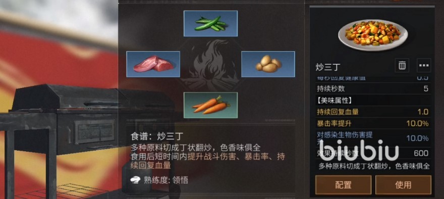 炒三?。褐谱魉枰牟牧嫌恤埂⑼炼?、胡蘿卜、豬肉,效果為增加一點(diǎn)生命回復(fù),暴擊率提升百分之十,對敵人造成傷害增加百分之十,每秒回復(fù)十二點(diǎn)三的饑餓值,效果持續(xù)時間為五秒,食物制作時間為二十秒,食用后冷卻時間為六百秒。