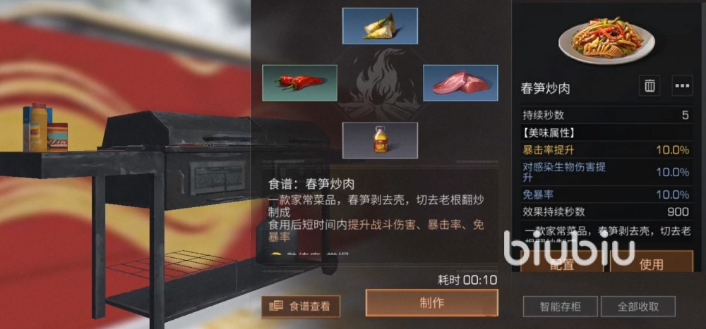 春筍炒肉:制作所需要的材料有辣椒、花生油、豬肉、竹筍,效果為提升百分之十的暴擊率、對病毒攜帶的角色攻擊時,會額外造成百分之十的傷害、免疫對方百分之十的爆傷。