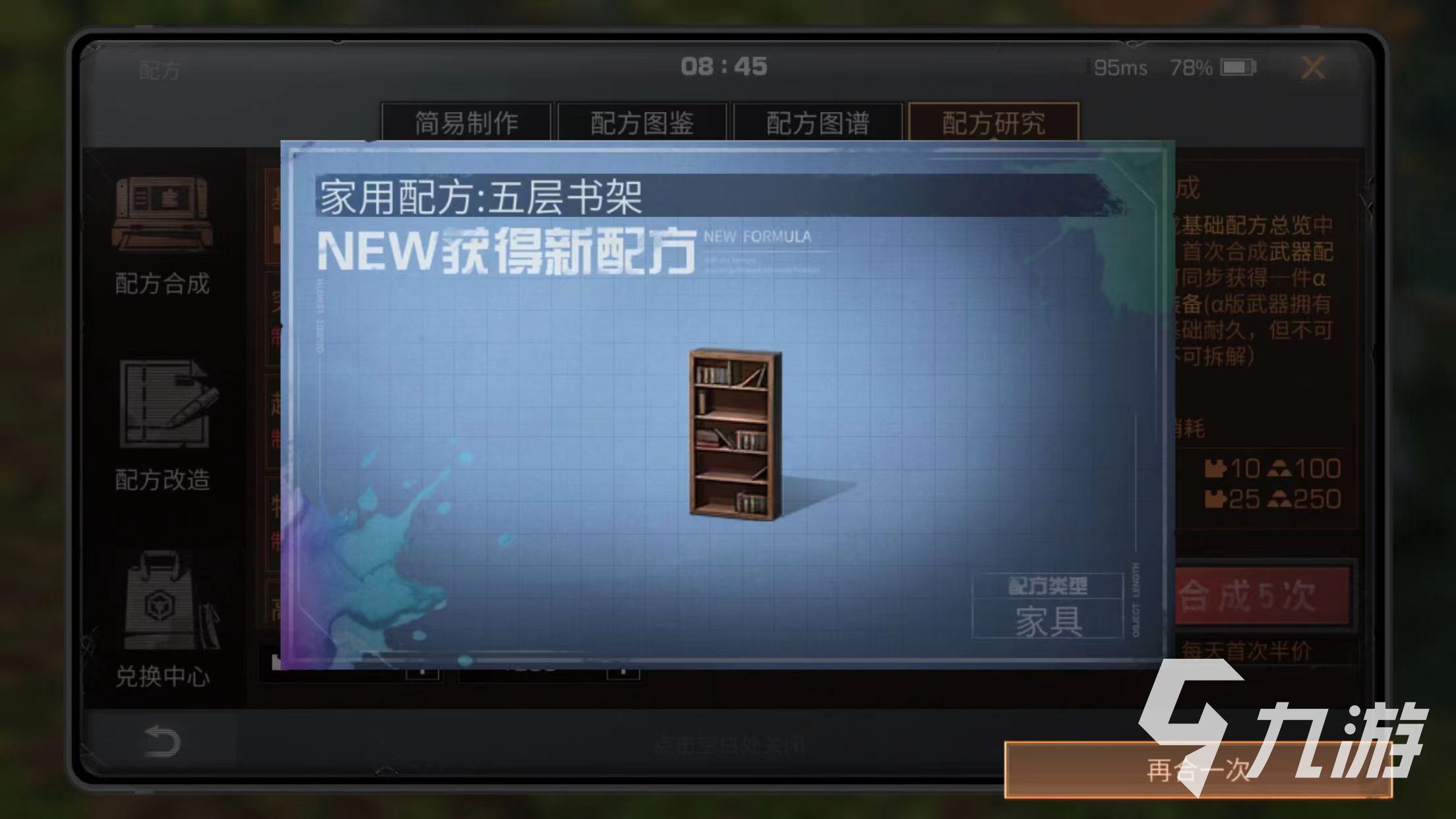 在配方研究中,包括配方合成,配方改造和兌換中心,在基礎(chǔ)合成中首次5次合成可以半價消耗道具,在究極合成,超級合成,特級合成,高級合成和中級合成等都可以通過5此合成獲得道具,每天首次都可以進行半價消耗道具。