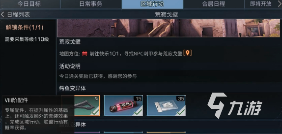 當玩家通過不斷的采集任務,直到采集等級達到110級后,可以在區(qū)域行動中看到聯(lián)盟行動荒寂戈壁任務,此任務需要玩家前往快樂101,到達地點后找到NPC即可參與聯(lián)盟行動荒寂戈壁活動,在此活動中包括5個BOSS。當玩家組隊成功通關(guān)后,可以獲得通關(guān)獎勵,對于不同的BOSS擊敗后可以獲得不同的獎勵,比如當擊敗鱷魚變異體后,可以獲得裝備配件和殘頁,當挑戰(zhàn)成功鼯鼠變異體后,可以獲得膠囊,殘頁和金幣獎勵。