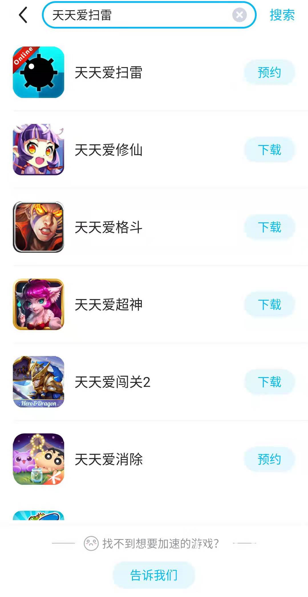 進(jìn)入搜索界面后,在搜索框中輸入天天愛(ài)掃雷,輸入完之后玩家可以在搜索框下方查看搜索結(jié)果。在搜索結(jié)果中查找天天愛(ài)掃雷,然后點(diǎn)擊右邊的下載按鈕即可。