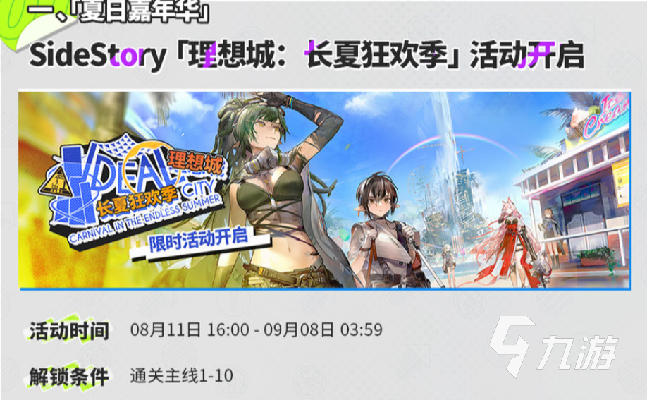 這個(gè)活動(dòng)的開(kāi)啟時(shí)間為八月十一日至九月八日,解鎖的條件是需要通過(guò)主線(xiàn)關(guān)卡1-10關(guān),活動(dòng)期間會(huì)開(kāi)放理想城:長(zhǎng)夏卡狂歡季活動(dòng),玩家可以通過(guò)活動(dòng)關(guān)卡作戰(zhàn)、活動(dòng)任務(wù)及活動(dòng)商店來(lái)獲取活動(dòng)獎(jiǎng)勵(lì)。