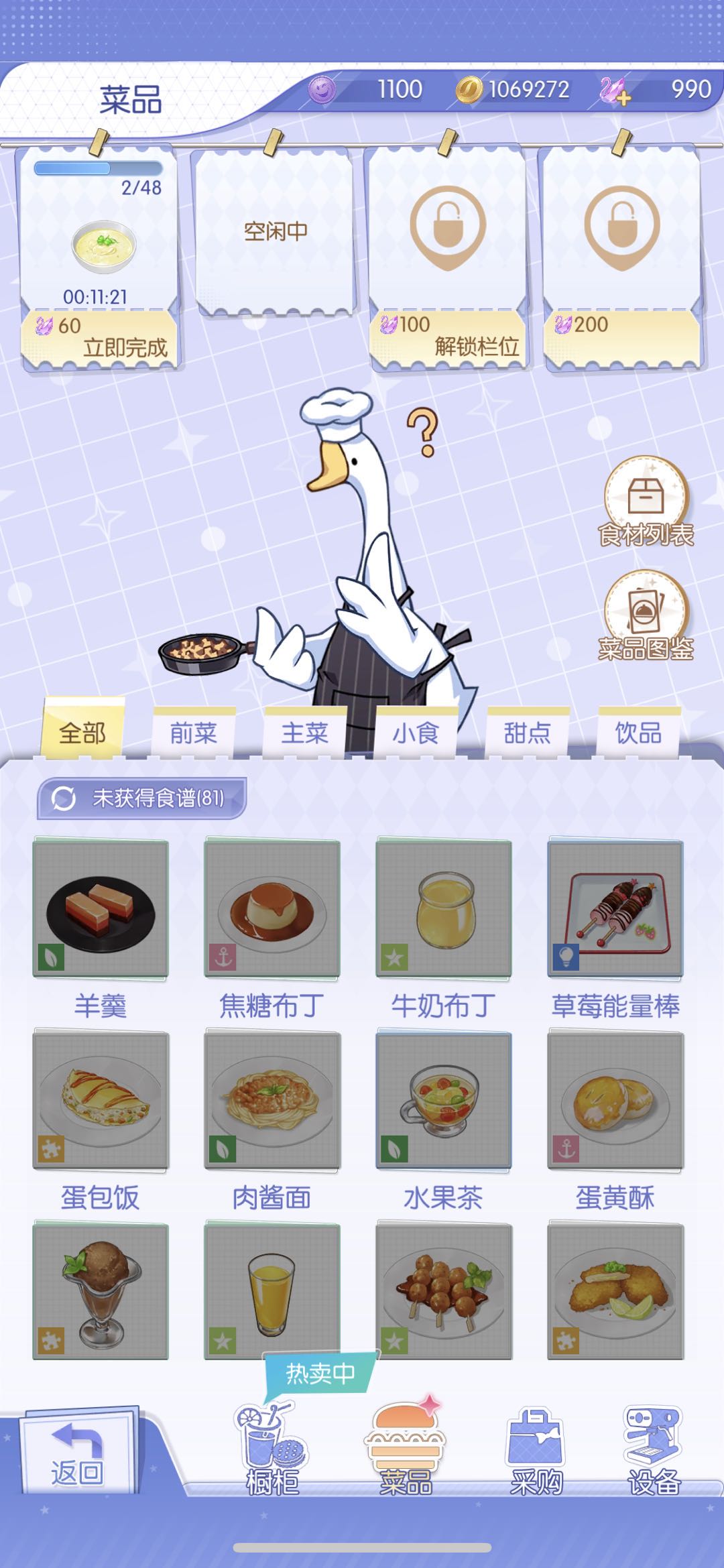 還有一點是關(guān)于菜品解鎖的問題,在游戲里面菜品也是通關(guān)主線任務(wù)的關(guān)鍵,游戲里面的菜品都是分質(zhì)量的,需要菜譜進行解鎖。非氪金玩家就不用去追求節(jié)日限定的菜譜了,那些都是裝飾用的,其實實際屬性和非氪就能獲取到的高級菜品是一樣的。玩家只需要獲取到足夠多的金幣就可以解鎖菜品了,然后就可以順利游玩了。