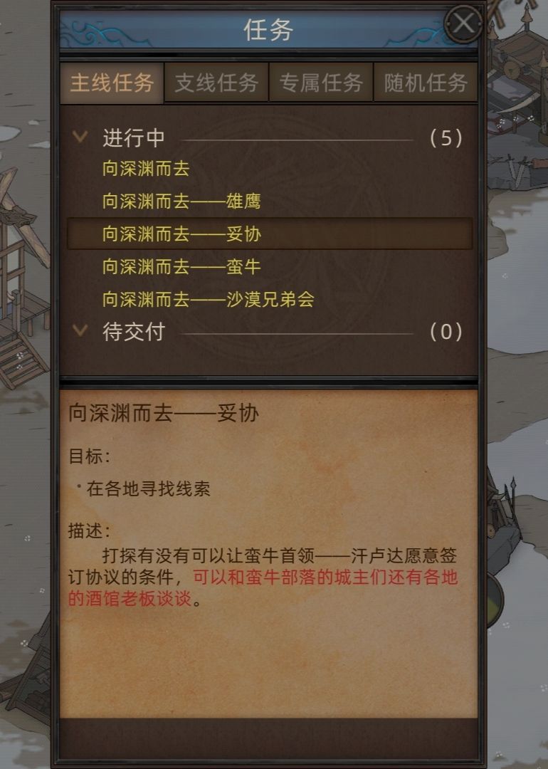 這個任務(wù)是主席納任務(wù)“向深淵而去”中的一個分支“妥協(xié)”,任務(wù)中需要玩家在各地尋找線索,尋找可以讓蠻牛首領(lǐng)妥協(xié),愿意簽訂契協(xié)議的條件。紅色字體提醒我們?nèi)フ页侵?、以及各地的一些酒館老板聊聊。很多人不知道這個酒館老板在哪,其實不難。