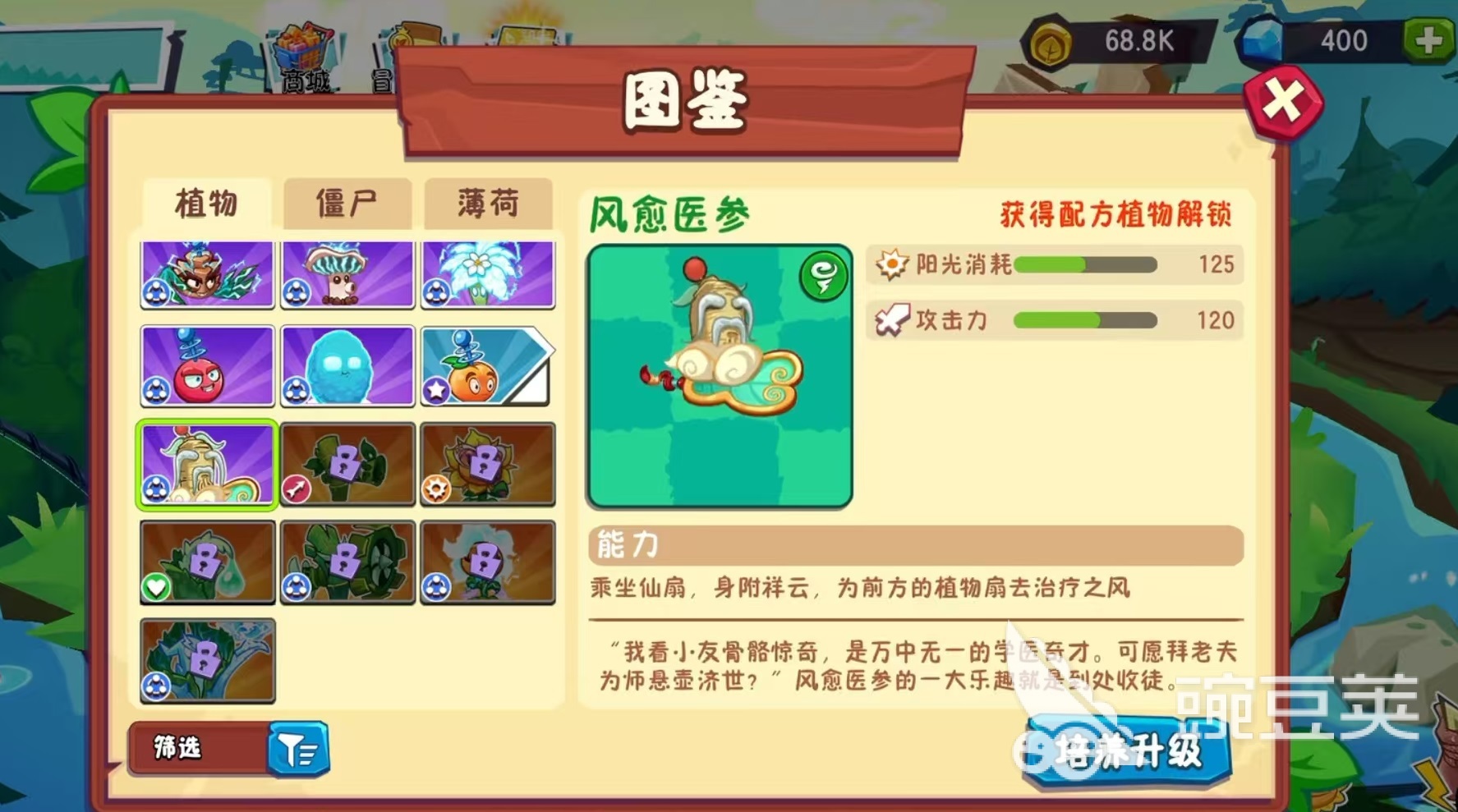 和其他很多植物相同,人參大師也有相應(yīng)的融合效果,人參大師和三葉草融合之后,能夠得到風(fēng)愈醫(yī)參。風(fēng)愈醫(yī)參乘坐仙扇,身負(fù)祥云,外觀非常有吸引力,可以給前方的植物扇去治療之風(fēng),另外攻擊力也有所增強(qiáng)。但融合之后的人參大師依然是屬于輔助類型,傷害可以忽略不計(jì),只是在治療效果方面更加出色。
