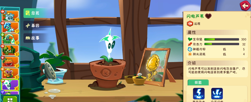 可以發(fā)射連鎖閃電攻擊僵尸,盡可能利用閃電攻擊更多的敵人。普通攻擊對右側(cè)1行的敵方發(fā)射閃電,觸發(fā)連鎖閃電命中最多3個(gè)敵方單位。技能“交叉閃電”,最多對右側(cè)3行內(nèi)距離最近的多個(gè)敵方目標(biāo)持續(xù)發(fā)射5次電流,每次造成180%攻擊力的傷害。