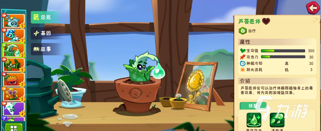 治療類型的植物,外觀就是個(gè)可愛的小蘆薈,可以治療并解除植物身上的毒素效果,并為其附加增益。普攻每隔10秒會投擲水滴,為自身周圍十字范圍內(nèi)驅(qū)散毒素,并附加5秒的“清流”效果,清流可每秒回復(fù)100%生命值,同時(shí)增加30%攻擊力。技能“清泉涌”,向全屏范圍植物投擲3個(gè)水滴,會優(yōu)先投向前排的植物,在對應(yīng)十字區(qū)域形成清流,清流可持續(xù)10秒存在。