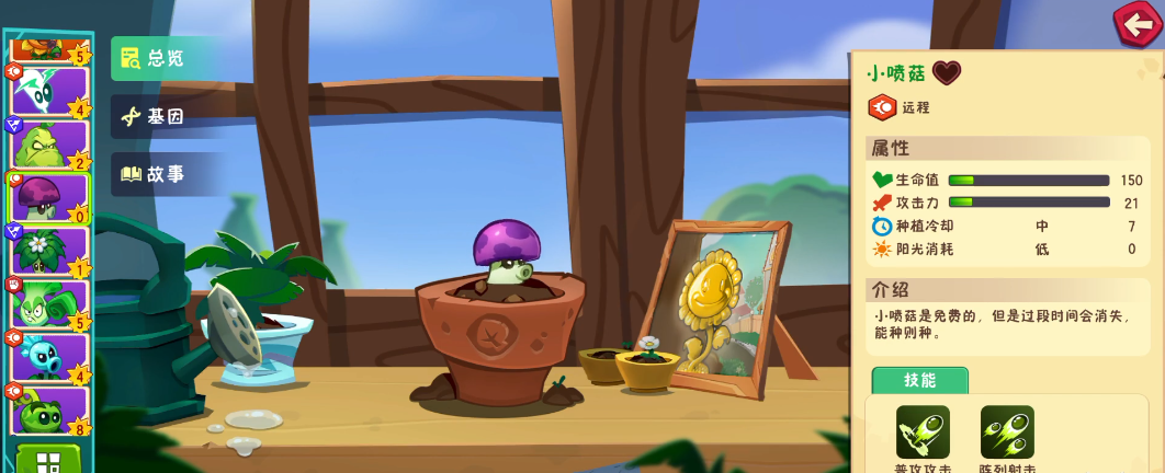 這是一種免費(fèi)植物,過段時(shí)間就會消失。普攻對右側(cè)1行噴射5次孢子流,對距離最近的單位造成75%傷害。技能使用后,在場的全部小噴菇一起發(fā)射孢子流,對命中的1個(gè)單位打出100%傷害。