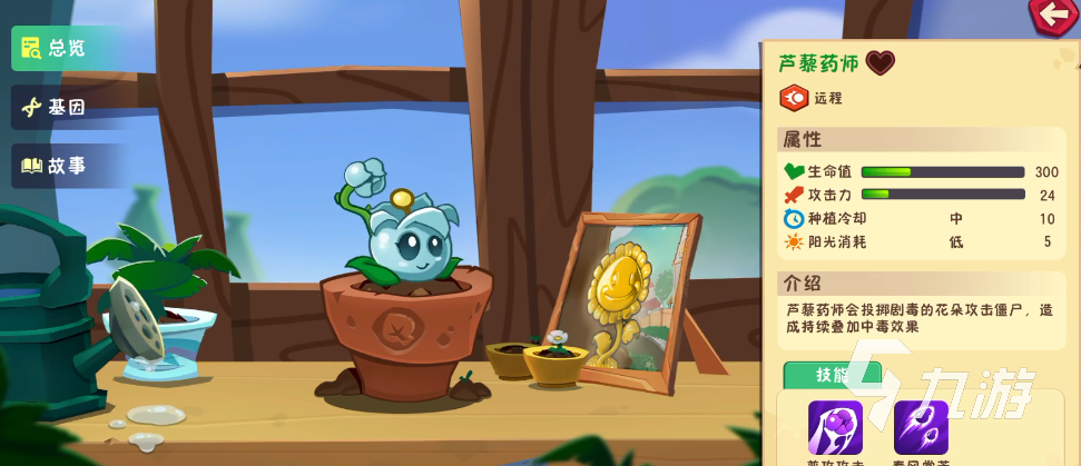 這是一種遠(yuǎn)程攻擊的植物,能投擲劇毒的花朵攻擊僵尸,造成持續(xù)疊加的中毒效果。普攻拋出花朵攻擊,攻擊附帶毒堿效果,毒堿可對目標(biāo)造成持續(xù)傷害,最多能疊加4層,每層傷害25。技能“春風(fēng)賞芳”,向最近三個(gè)單位投擲毒瓶,對1X1范圍內(nèi)的敵方造成100%傷害并疊加毒堿。