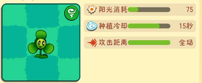 這個(gè)植物也是當(dāng)下的新的植物。這個(gè)植物在玩家們通過野營(yíng)地之后便可以獲取到了。從目前的數(shù)據(jù)來看,這個(gè)植物是一個(gè)偏輔助類型的植物。它每次種植會(huì)消耗75點(diǎn)陽(yáng)光。輔助的范圍則是全場(chǎng),它本身不可以進(jìn)行攻擊。在種植下去之后可以發(fā)動(dòng)能力,它可以吹走所有的氣球僵尸和迷霧,如果和植物進(jìn)行疊加種植的話則是可以讓其進(jìn)化為風(fēng)系植物。