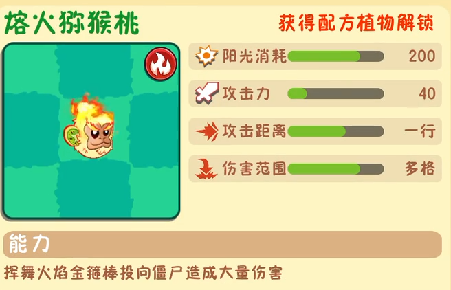 這個(gè)植物便是上面獼猴桃進(jìn)化之后的產(chǎn)物,玩家們?cè)讷@取到配方之后便可以進(jìn)行進(jìn)化。這個(gè)植物所需要的陽(yáng)光比較高,需要200點(diǎn)才可以進(jìn)行召喚。它的攻擊力相比于獼猴桃來說降低了不少,它的攻擊力只有40。但是它本身的攻擊不再是單個(gè)的攻擊,它可以對(duì)多個(gè)僵尸造成傷害。本身的攻速也算是比較快的。熔火獼猴桃的能力是可以使用金箍棒對(duì)前方的僵尸造成大量的傷害,并且還附帶火焰效果。從目前實(shí)戰(zhàn)來看這個(gè)獼猴桃本身的能力還是很強(qiáng)的。但是每次召喚的消耗挺大的。