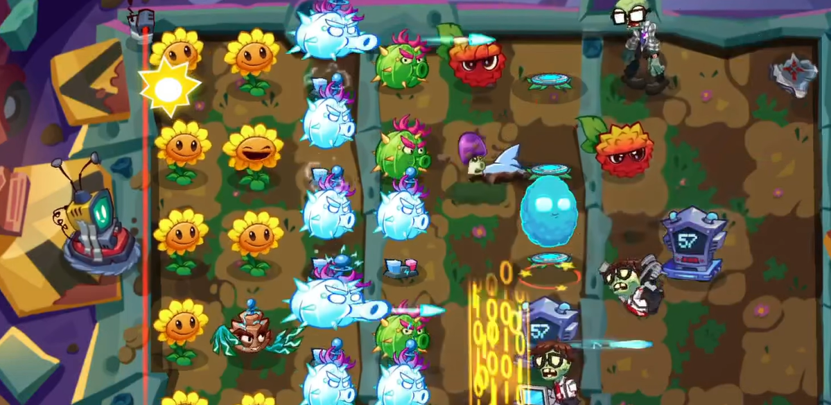 當大家通過第一關(guān)之后,到了第二關(guān)就會出現(xiàn)機械墓碑,從天上會出現(xiàn)大量的墓碑,要在規(guī)定時間內(nèi)將其擊破。這里就需要用上電流醋栗,他可快速破碑。再搭配上小噴菇,就可以造成電流輸出效果,輸出效率更高。
