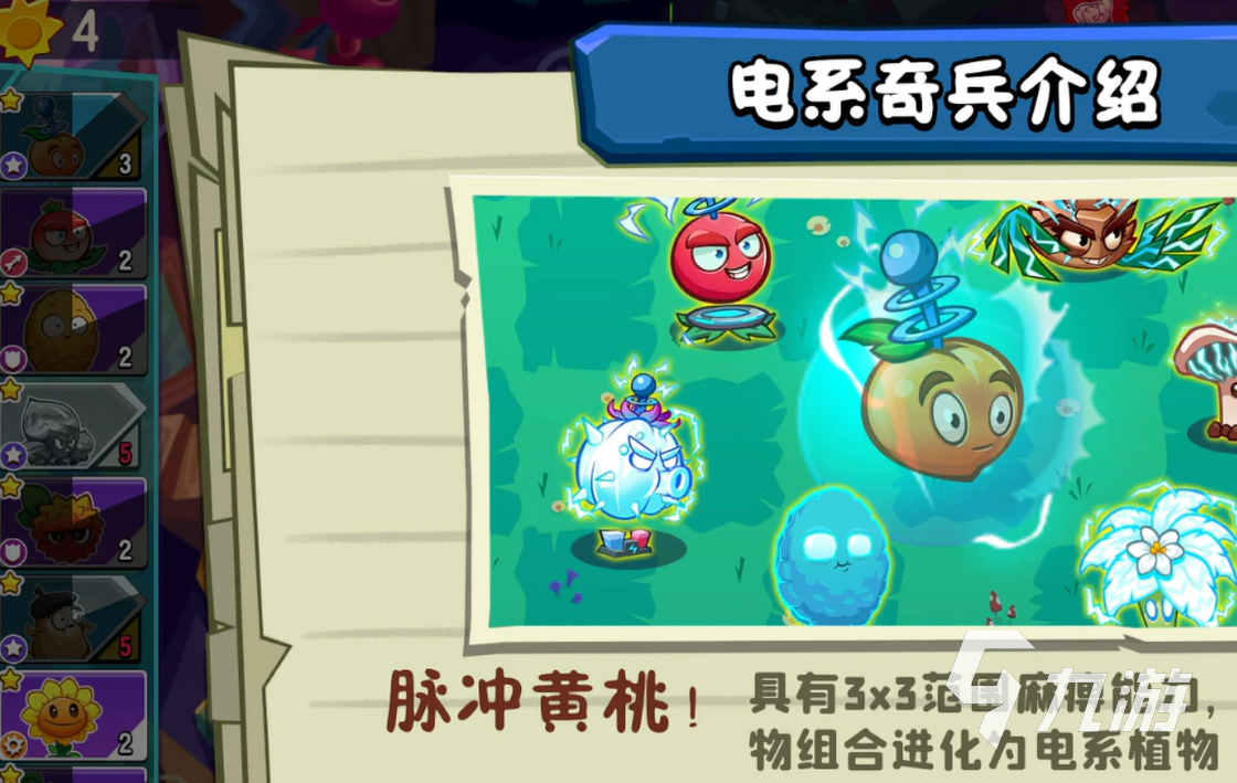 在攻打之前,大家可以先準備好一些有用的植物。第一個推薦大家用脈沖黃桃,用了它就可以讓一些植物進化成為電系,這樣就可以具備麻痹能力。因為在這個關(guān)卡的地圖頂端會出現(xiàn)三個電磁發(fā)射裝置,會對非電系植物造成麻痹以及額外傷害,所以大家就一定要帶電系植物。