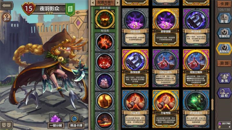 這款游戲擁有千變?nèi)f化的戰(zhàn)略組合,如何組建自己的卡組是這個(gè)游戲勝利的關(guān)鍵,首先我們可以選擇一個(gè)強(qiáng)力的英雄,每個(gè)英雄都有專屬的天賦,選擇天賦高血量高的英雄最為保險(xiǎn)。之后就是選擇專屬秘技和通用秘技來戰(zhàn)斗。專屬秘技是專屬于你選擇的英雄陣營(yíng)的秘技,通用秘技是所有英雄都可以使用的。我們需要根據(jù)英雄的天賦來選擇合適的秘技,有些秘技的配合還可以打出聯(lián)動(dòng)的傷害。